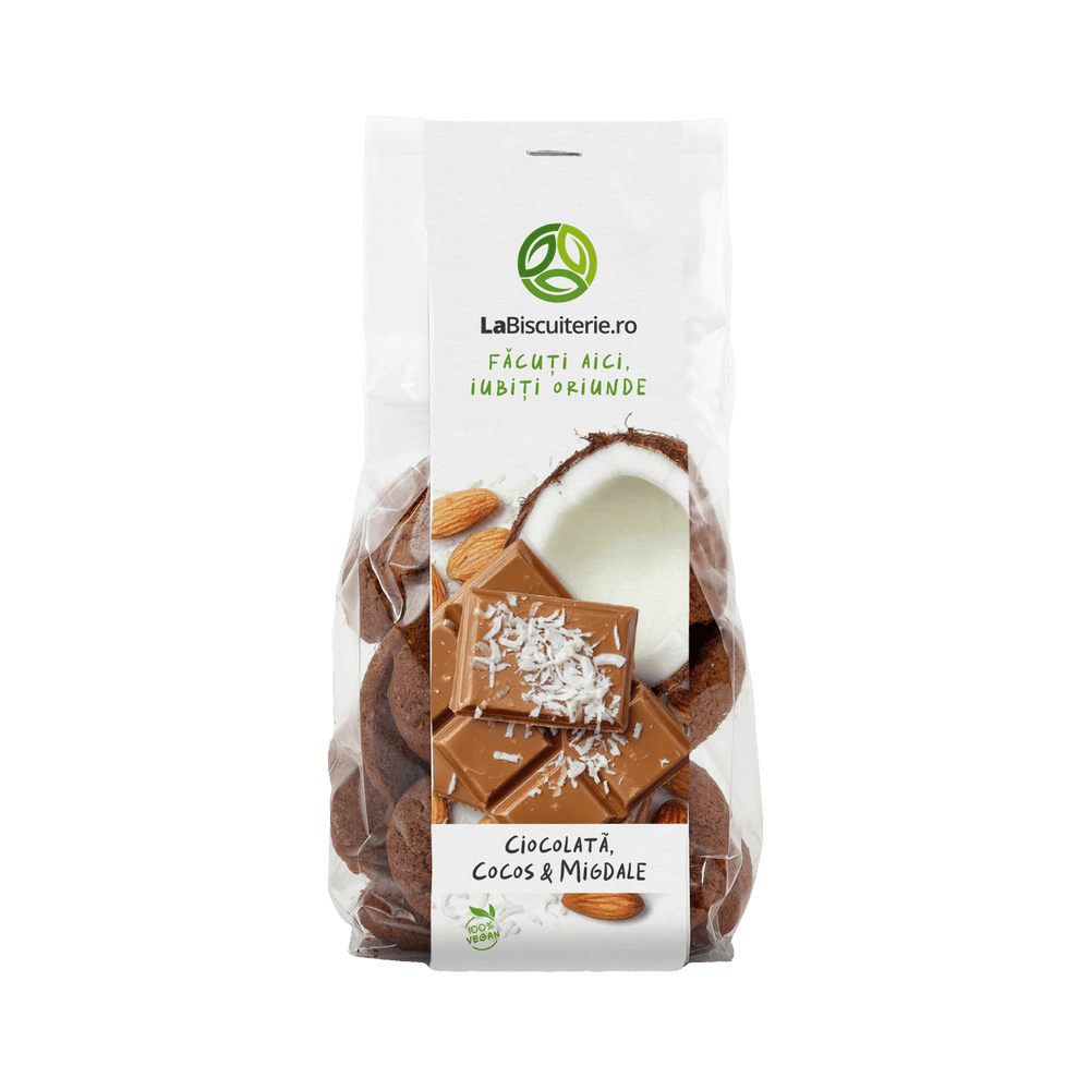 Ingrediente: făină integrală de grâu, făină de migdale, sirop de agave BIO, ulei de cocos, cacao pudră, fulgi de cocos, ulei esenţial de cocos, bicarbonat de sodiu, oţet de mere, sare de Himalaya.