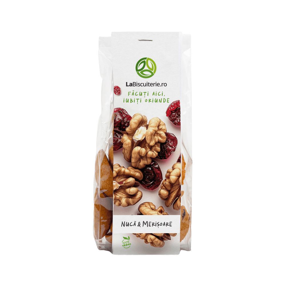 Ingrediente: făină integrală de grâu, sirop de agave BIO, ulei de cocos, nucă măcinată, merişoare, vanilie, bicarbonat de sodiu, oţet de mere, sare de Himalaya.
