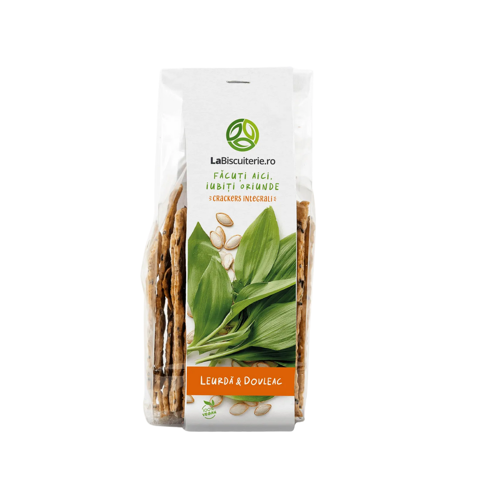 O combinaţie rafinată dintre aroma proaspătă a leurdei şi intensitatea seminţelor de dovleac, aceşti crackers sunt ideali pentru cei care apreciază gustări naturale, pline de savoare şi beneficii nutriţionale.
