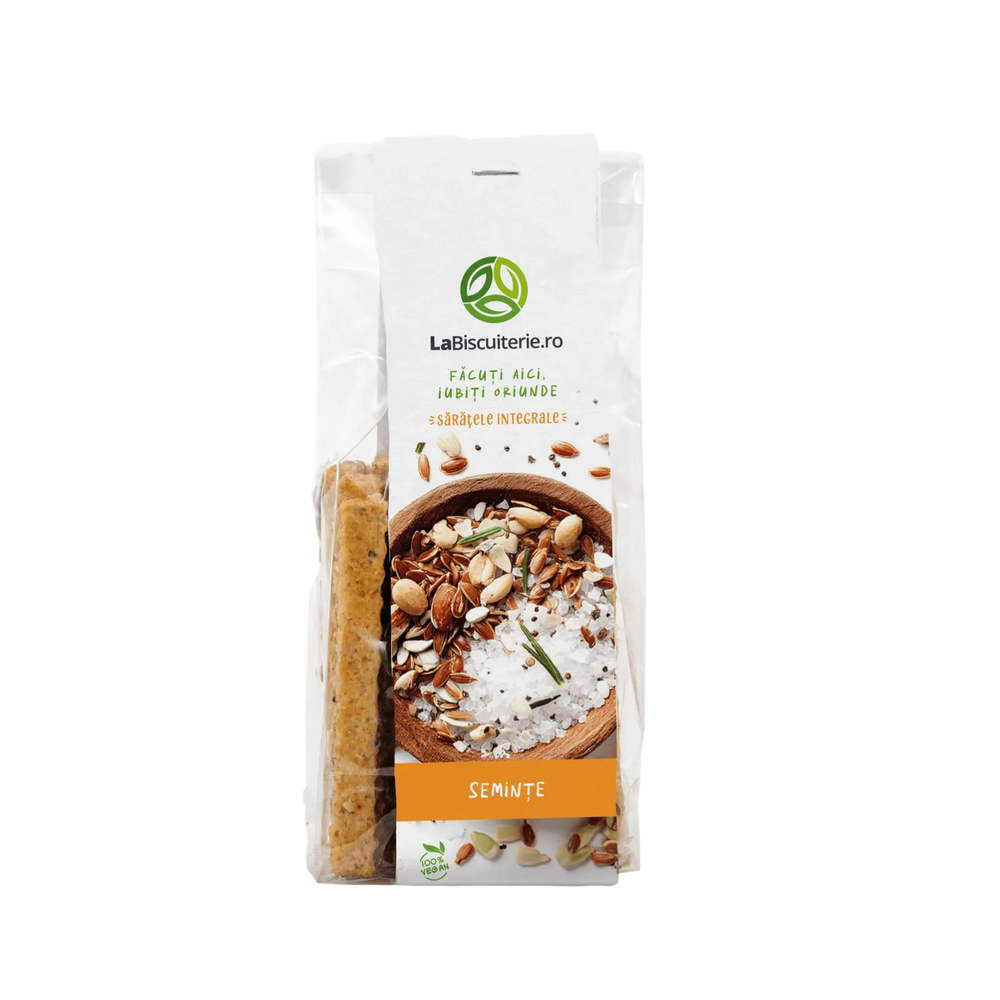 Ingrediente: făină integrală de grâu, făină de integrală de secară, ulei de cocos, seminţe de susan alb, seminţe de susan negru, seminţe de floarea soarelui, seminţe de dovleac, seminţe de in, drojdie, bicarbonat de sodiu, oţet de mere, sare de mare.